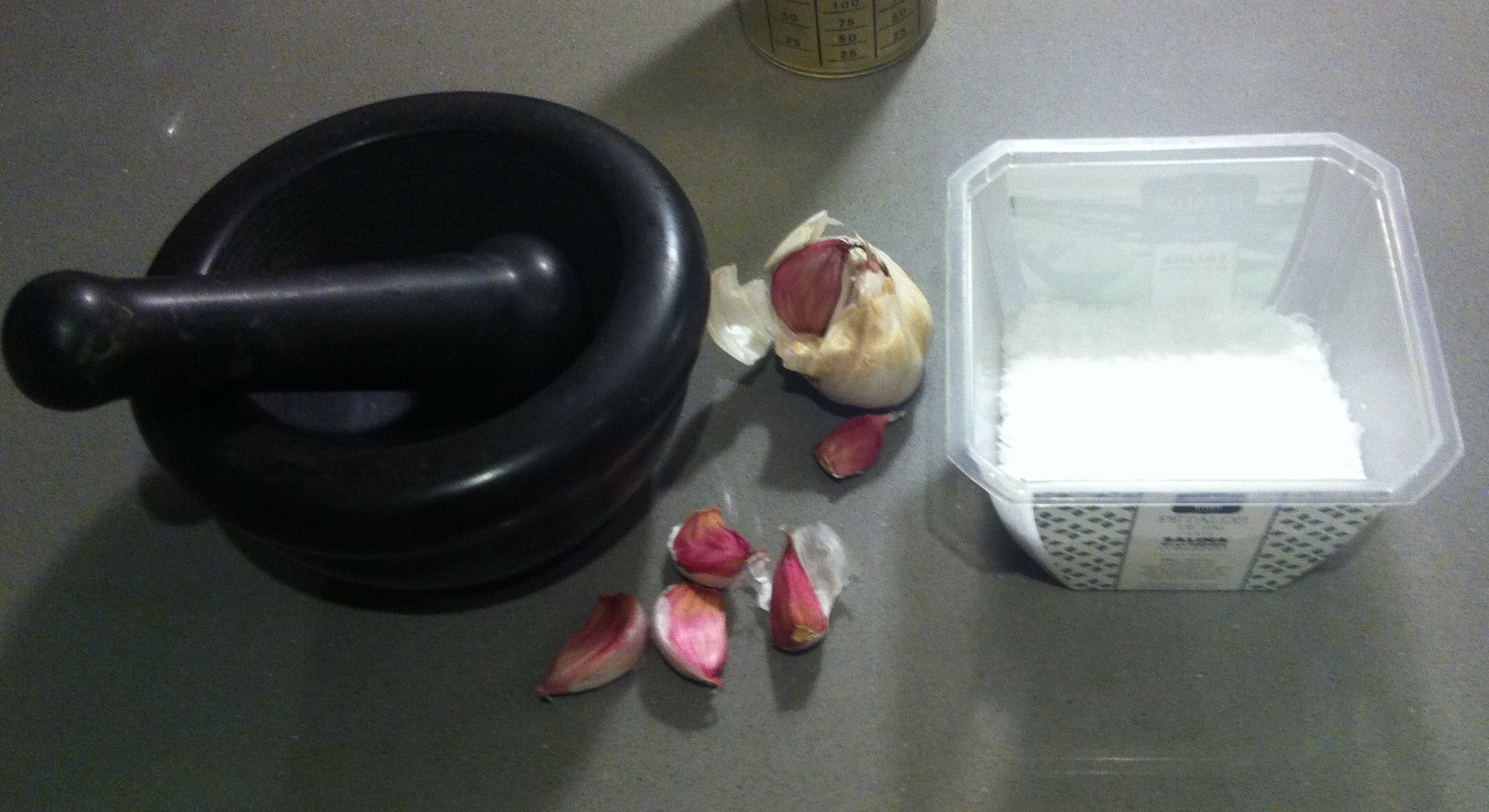 Lo primero que haremos será cortar muy finos 3 ó 4 dientes de ajo ( a gusto del consumidor ) y ponerlos en el mortero junto con un poco de sal gorda. Lo machacamos todo y nos tiene que quedar una especie de pasta. Reservamos.