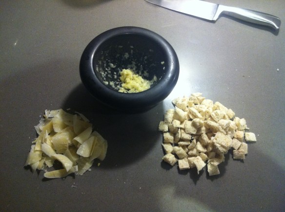 Cortaremos también el pan de molde en pequeños cuadrados para hacer los picatostes y el queso parmesano en lascas, para añadirlo al aliño.