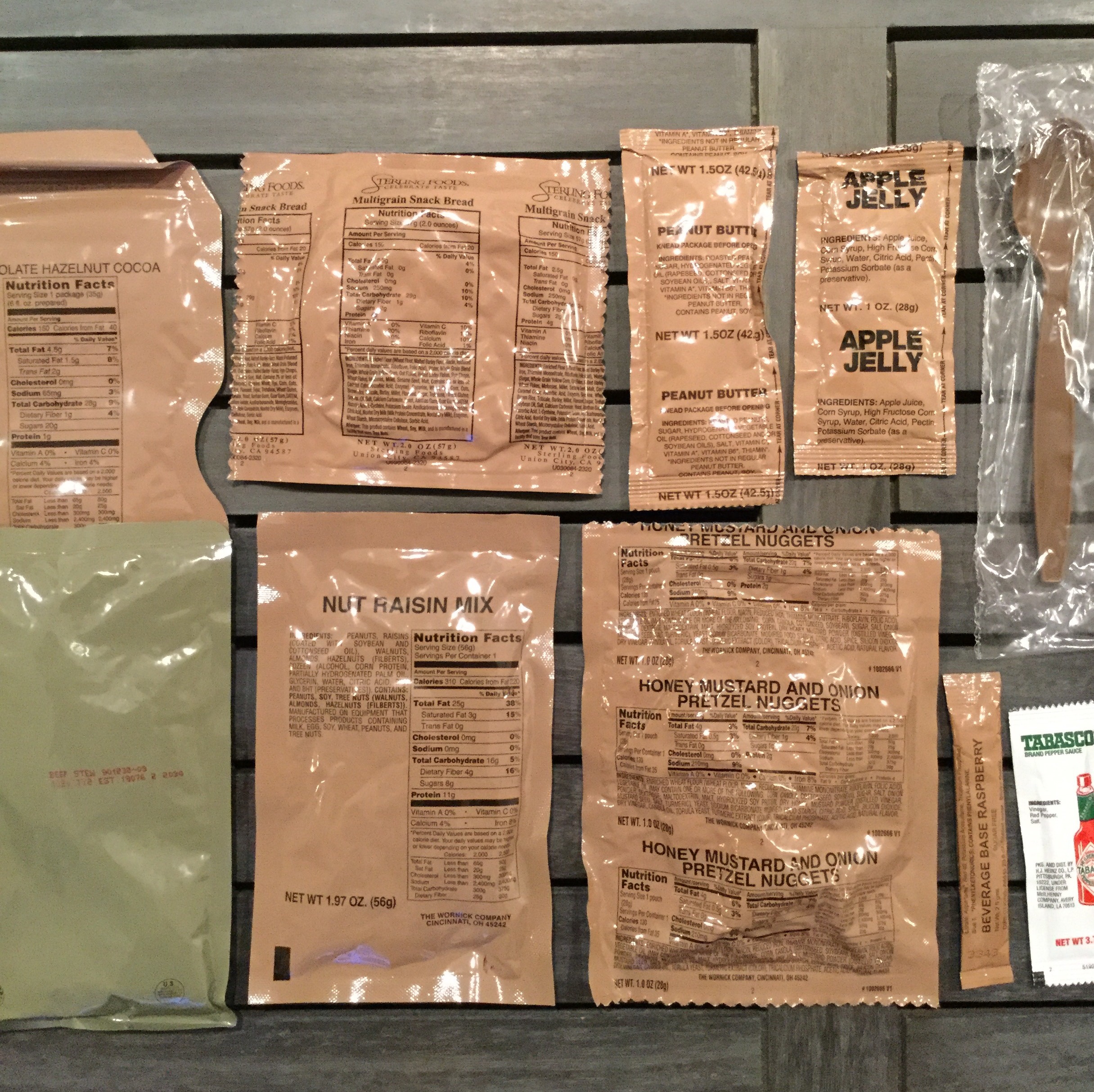 Y he aquí desplegado el contenido de esta bolsa. El sobre de la izquierda contiene el plato principal, el estofado. Con él podemos encontrar otro sobre con polvos para hacernos un batido de cacao y coco, otro con un mix de cacahuetes y nueces, nuggets de mostaza y ajo, gelatina de manzana, la omnipresente crema de cacahuete, una cuchara de plástico, otro sobre para hacernos una bebida de frambuesa, un sobre de tabasco, un pequeño paquete de papel higiénico, dos chicles, toallitas húmedas, un sobre con sal y el sobre más grande y claro que observamos a la derecha, lleno de carburo, que al añadirle unas gotas de agua genera calor, de tal manera que al ponerlo al lado del sobre del estofado lo calentará, sin humos, sin luces, sin fuego…muy táctico.