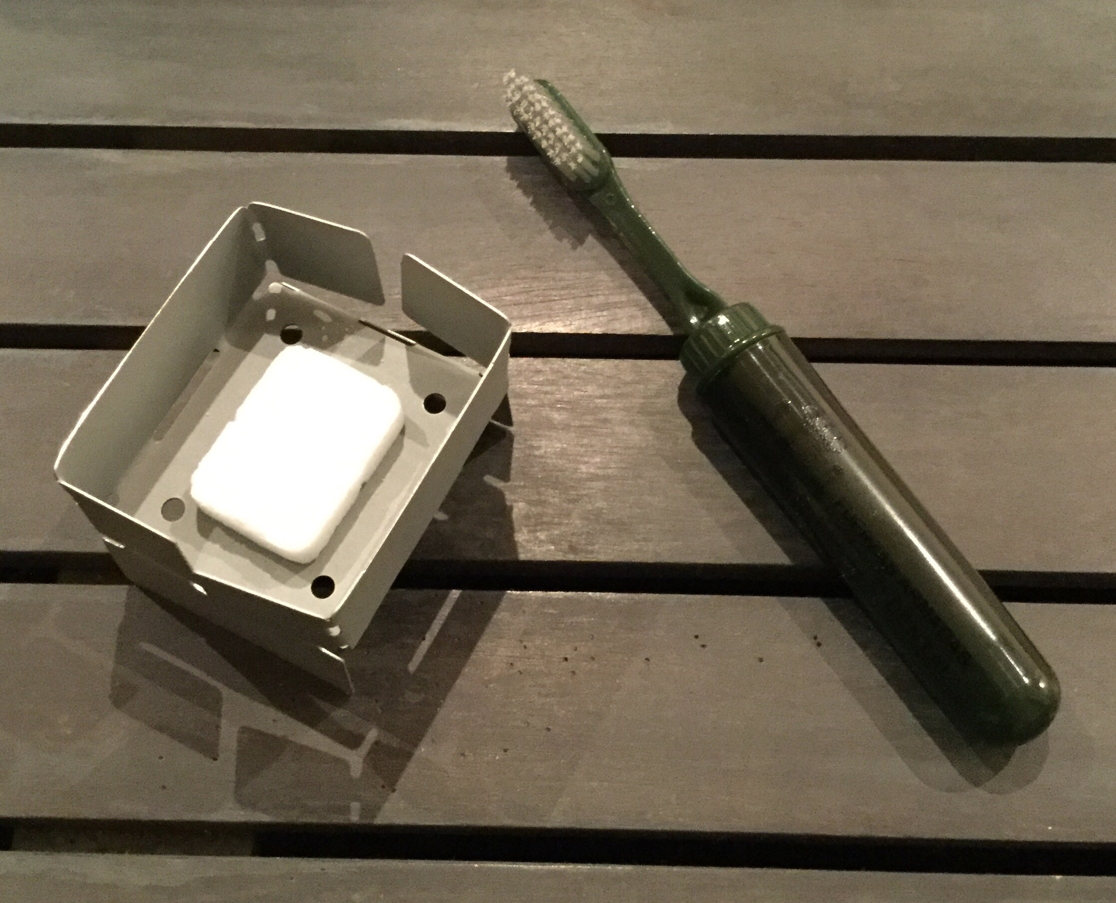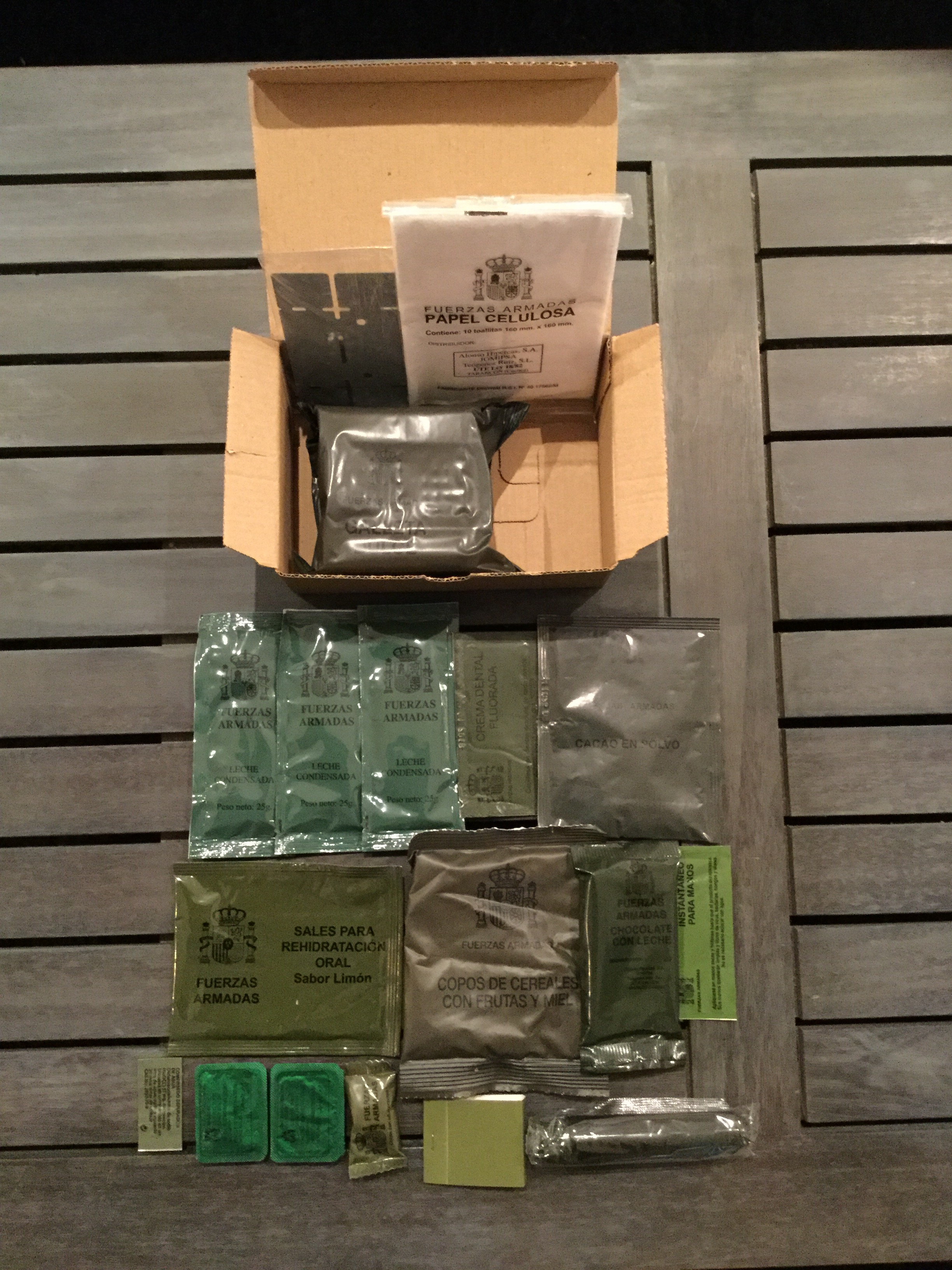 Esta pequeña caja, de la que existen otras 4 versiones, contiene lo necesario para que un soldado espabile debidamente antes de que salga el sol. Un hornillo plegable, un sobre con papel de celulosa, un paquete de galletas, leche condensada, crema dental, cacao en polvo, sales de rehidratación, copos de cereales y frutas, una tableta de chocolate, desinfectante de manos, pastillas depuradoras de agua, dos pastillas de combustible sólido, chicle, un paquete de cerillas ( tan vintage…y tan útil ) y un cepillo de dientes.