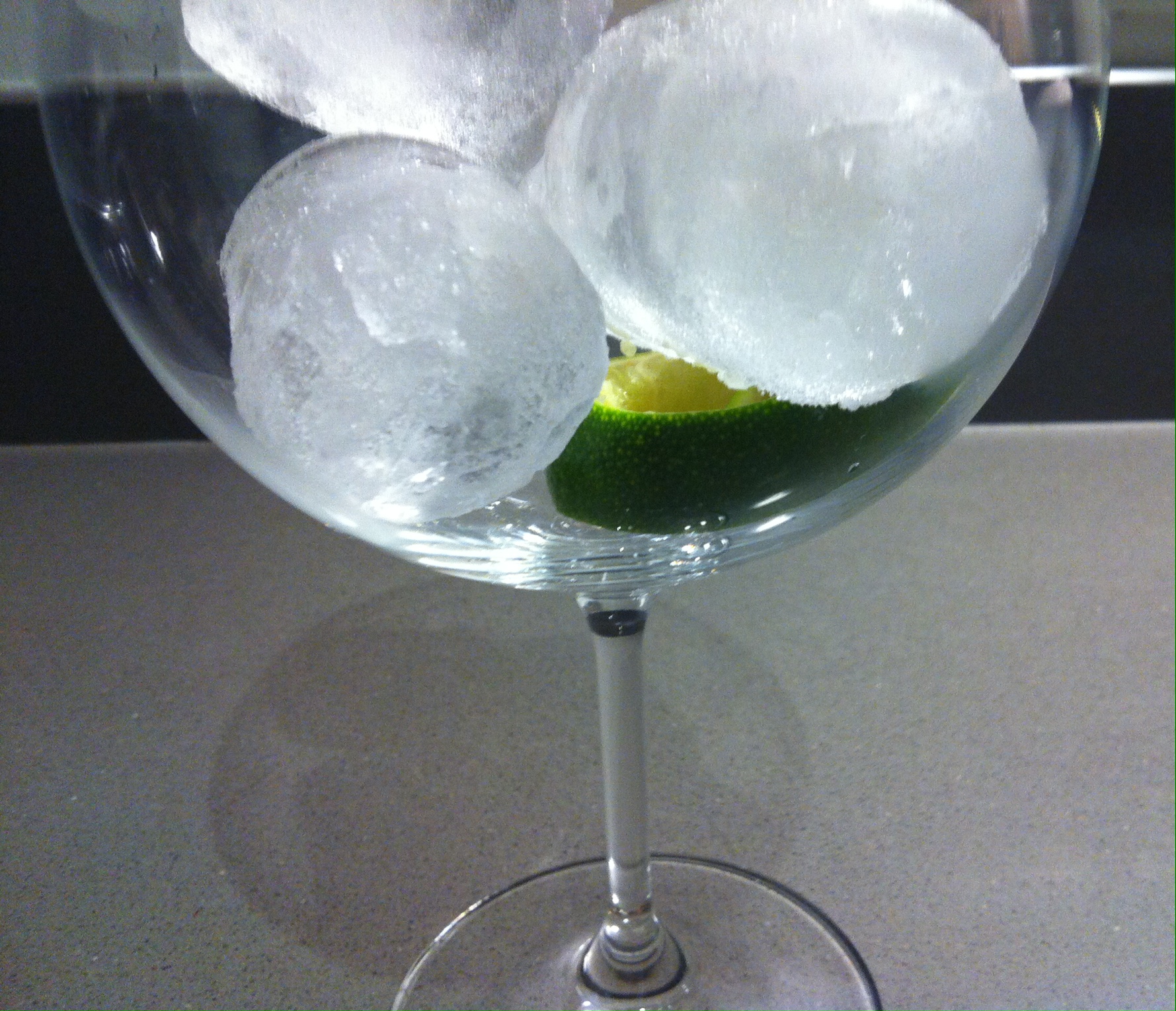 Hecho esto, añadimos la ginebra. Si la tónica es de 20 cl., significa que emplearemos 5 cl. de ginebra ( aunque eso varía con los gustos, por supuesto ) La echaremos en la copa desde cierta altura, lo que ayudará a incrementar su sabor. Posteriormente, añadimos la tónica. Podemos hacerlo ayudándonos de una cuchara trenzada ( muy fashion pero que hace que la tónica pierda parte del CO2 ), o bien echarla muy despacio, o utilizando el viejo truco de echarla sobre la parte ovalada trasera de una cuchara. ¡Nunca agujerear la chapa de la tónica para que salga a presión!