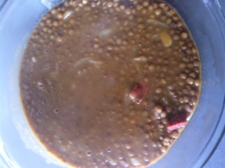 Por otra parte, tenemos que preparar un mejunje. Lo haremos en un recipiente con 4 cucharadas de aceite de oliva, una cucharada de salsa de soja, una cucharada de mostaza ( la que más os guste, pero nada de cutradas de burguer ), una pizca de pimienta, una cucharadita de vinagre de Jerez y media cucharadita de caldo de carne. Todo esto lo mezclaremos bien, hasta que quede un líquido homogéneo, y hecho esto, añadiremos los taquitos de atún y la cebolla (no hay por qué echarla toda, eso va con los gustos). Mezclamos todo para que se impregne bien, y dejamos marinar 8-10 minutos.