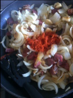 Rehogamos todo en una sartén con un poquito de aceite y cuando vaya cogiendo colorcito echamos pimentón dulce (suficiente para que coja color)